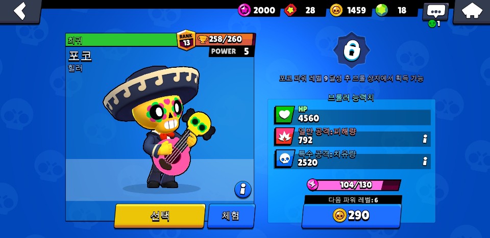 레벨 9->10을 가려면 박스를 열어서 1%의 확률로 나오는 or 상점에서 2,000골드에 구매 가능한 스타 파워를 얻어야 레벨업이 가능함.